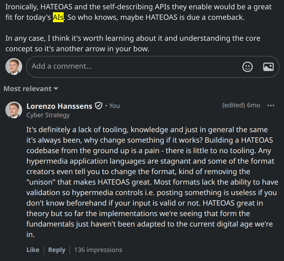 The worst part of all this? People suggesting AI will magically make HATEOAS better. Not the implementation part, but to discover APIs? Are you kidding me?
